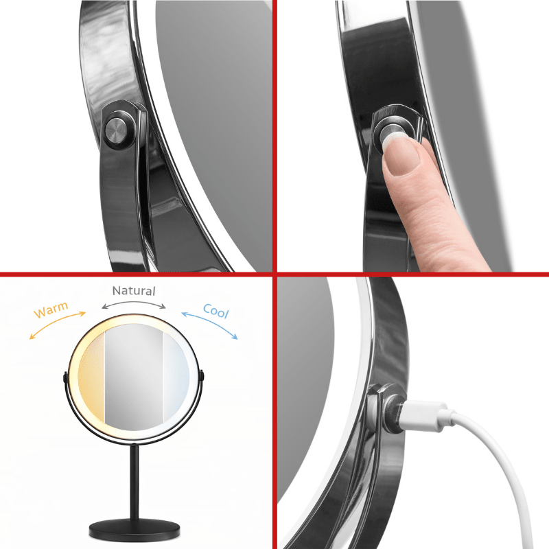 Wiederaufladbarer LED-Tischspiegel mit einem kraftvollen, integrierten LED-Licht, das in drei verschiedenen Lichttönen eingestellt werden kann: warm, neutral und kalt. Mit einem diskreten Touch-Knopf an der Seite kannst du ganz einfach Ein/Aus, die Auswahl der Lichtfarbe und die Einstellung der Helligkeit mit der integrierten Dimmfunktion steuern.