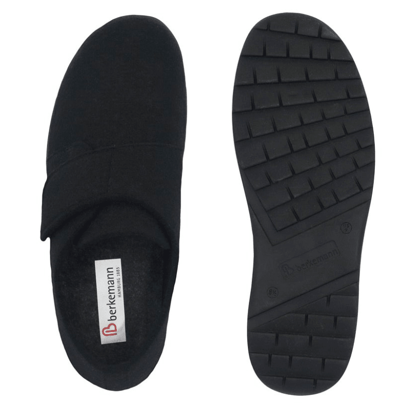 Berkemann hjemmesko i mørkt filt, designet med praktisk velcrolukning, så den er nem at tage på/af samt justere til foden.