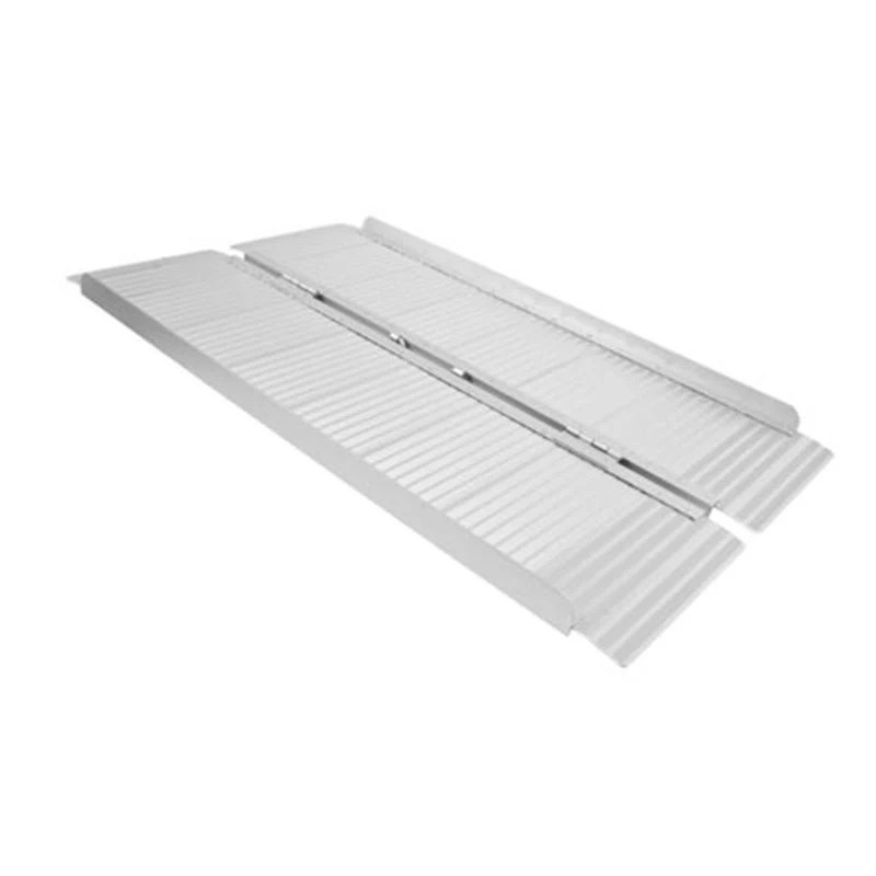 Rampe en aluminium avec surface striée et poignée de transport. La rampe est pliable dans le sens de la longueur, ce qui la rend facile à déplacer et à transporter.