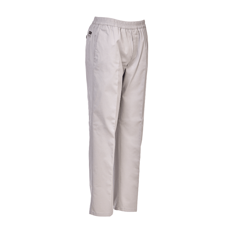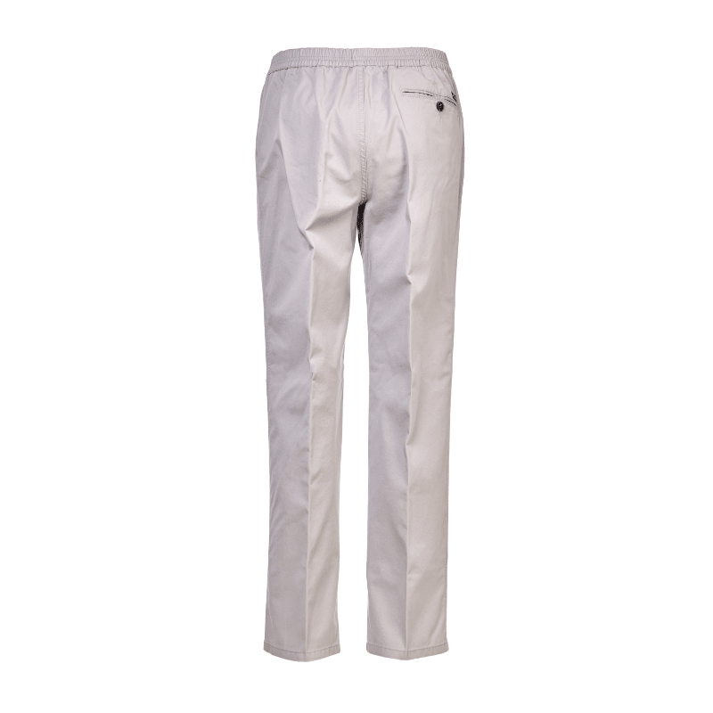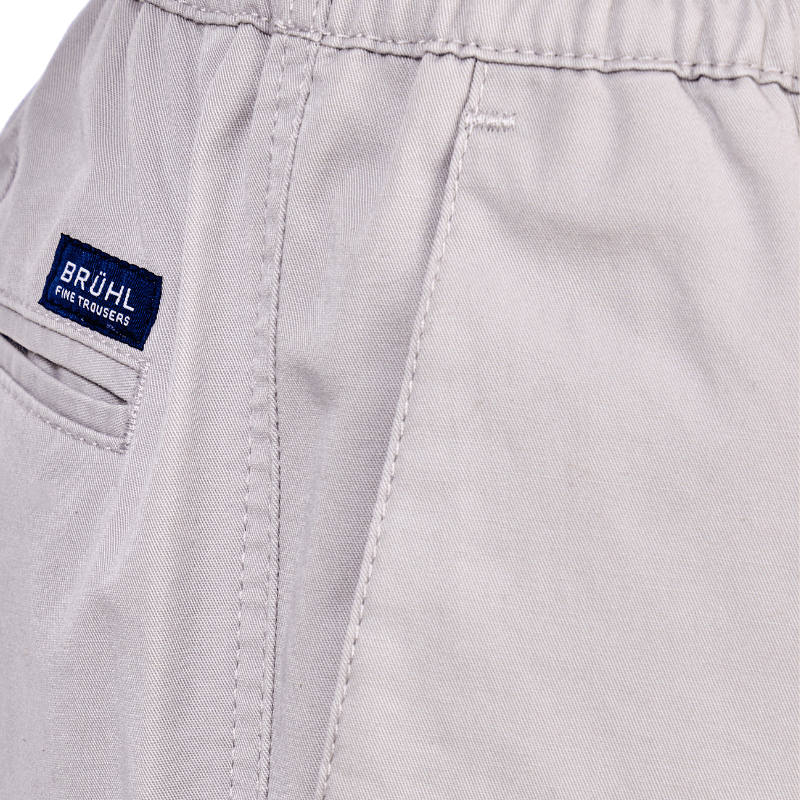 Pantalons beiges, classiques et légers en tissu doux de Brühl, dotés d'une taille élastique - sans boutons ni fermeture éclair. Ces pantalons possèdent deux profondes poches avant et une poche arrière simple avec fermeture par bouton.