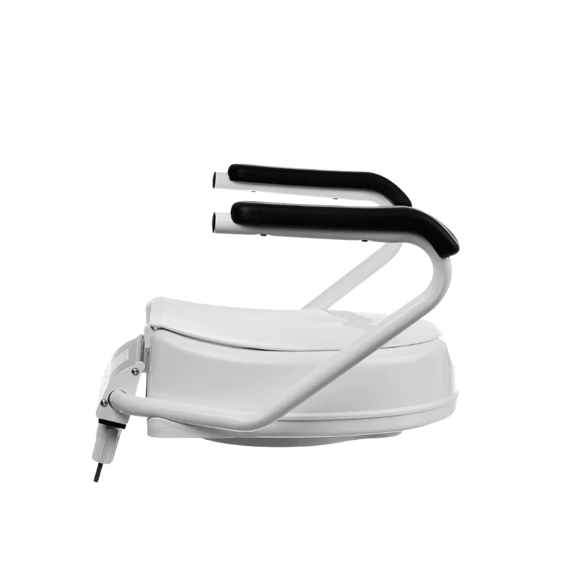 Le rehausseur de toilettes est équipé d'accoudoirs et d'un couvercle, et il augmente la hauteur de 10 cm. Les accoudoirs peuvent être relevés et abaissés indépendamment l'un de l'autre.