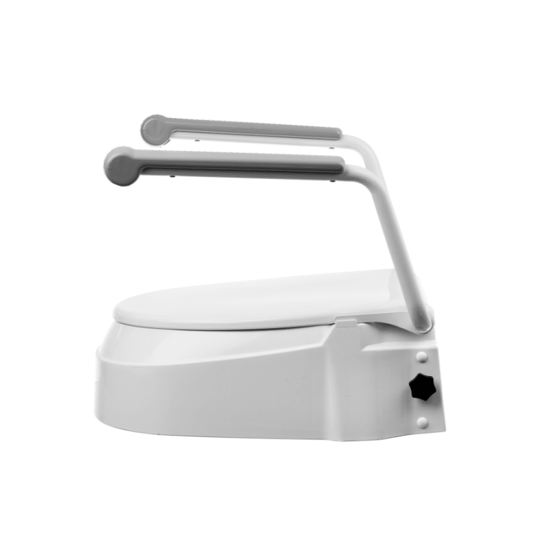 Livré avec des accoudoirs rabattables pour un accès latéral aux toilettes. Les accoudoirs peuvent être retirés, individuellement également. Le siège lui-même ne peut pas être relevé.
