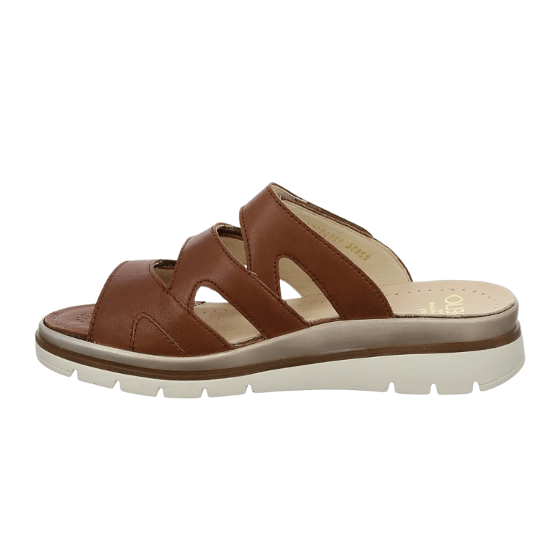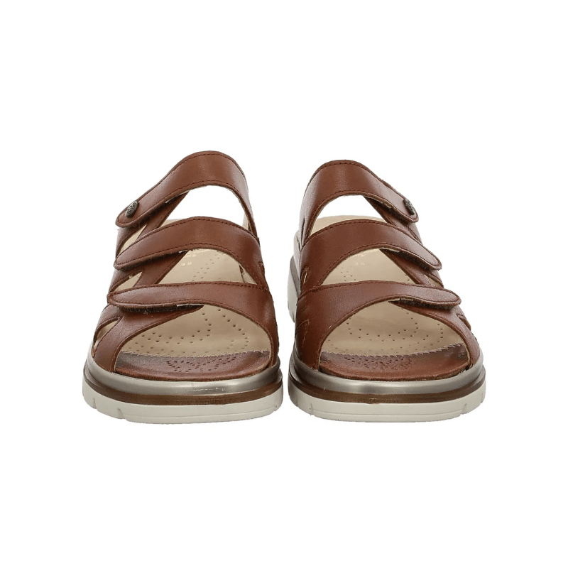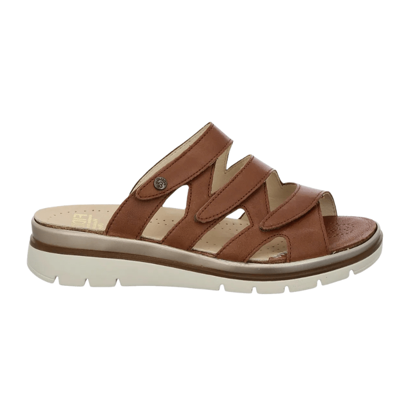 Super bequeme und geräumige Damen-Pantoffel von Fidelio aus glattem Leder in einem goldbraunen Farbton – einfach zum Reinschlüpfen. Die Sandale verfügt über flexible Klettverschlüsse und ist leicht gepolstert, sodass sie sich dem Fuß anpasst und Druckstellen, beispielsweise bei Hallux Valgus, reduziert.